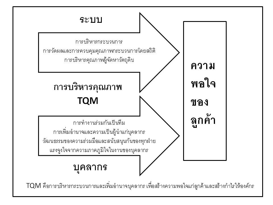 TQM คือการบูรณาการกิจกรรมทั้งหมดขององค์กรเพื่อให้บรรลุเป้าหมายในการตอบสนองความต้องการลูกค้า โดยการกำหนดมาตรฐาน การมุ่งให้เกิดประสิทธิภาพ การกำหนดหน้าที่ของบุคลากรในกระบวนการต่างๆทั่วทั้งองค์กร การลดความผิดพลาดในกระบวนการทำงานและลดจำนวนผลิตภัณฑ์หรือบริการที่บกพร่องโดยประยุกต์ใช้การควบคุมคุณภาพกระบวนการโดยสถิติ และใช้การร่วมกันทำงานเป็นทีมในการวางแผนและดำเนินงานตามกระบวนการอย่างมีประสิทธิภาพ ดังนั้นผู้นำองค์กร TQM จึงต้องสร้างวัฒนธรรมองค์กร ที่บุคลากรทั้งหมดทุกฝ่ายในองค์กร ร่วมกันทำงานอย่างประสานสอดคล้องเป็นทีมเดียวกัน เพื่อสร้างคุณค่าในการส่งมอบผลิตภัณฑ์หรือบริการที่มีคุณภาพให้แก่ลูกค้า